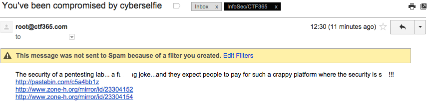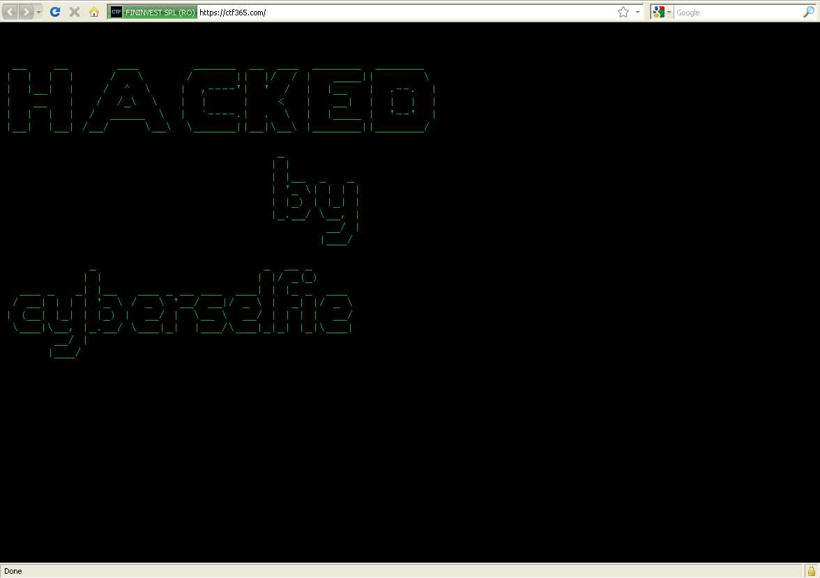 It appears that the well funded and connected online pentesting lab, CTF365.com was compromised within (at least) the last few minutes. At this point it is unsure to what degree the site/infrastructure has been compromised, but it is safe to say that a number of user accounts of the pastebin document have been verified. Currently the site shows a simple ASCII art front page claiming the hack was completed by CyberSelfie.